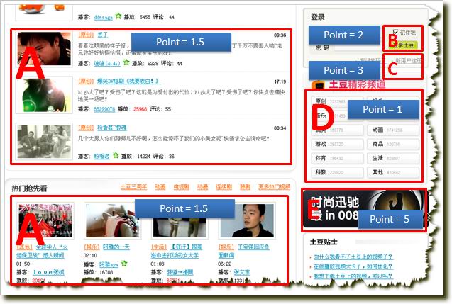 考慮這個頁面的不同交互,哪些是你認為重要的,哪些是次重要的,哪些是不重要的。在這個例子中,我們假設存在一個在線營銷活動,我們最希望用戶點 擊E區,訪問“時尚迅馳”的活動頁面;其次,我們希望用戶盡量注冊我們的網站,也就是C區,然后我們希望用戶登陸,即B區;再次,我們希望用戶至少能夠訪 問頁面中的視頻,即A區。最后,最低限度,我們覺得用戶點擊訪問“精彩頻道”(D區)也有點兒價值,只不過價值沒有前述行為那么大。這樣,我們就有了一個 圖景:用戶訪問的價值從大到小依次是:E>C>B>A>D。