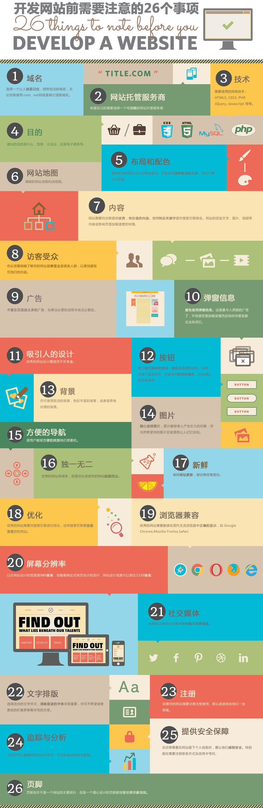 1、域名 2、網站托管服務商 3、技術 4、目的 5、布局和配色 6、網站地圖 7、內容 8、訪客受眾 9、廣告 10、彈窗信息 11、吸引人的設計 12、按鈕 13、背景 14、圖片 15、方便的導航 16、獨一無二17、新鮮 18、優化 19、瀏覽器兼容 20、屏幕分辨率 21、社交媒體 22、文字排版 23、注冊 24、追蹤與分析 25、提供安全保障