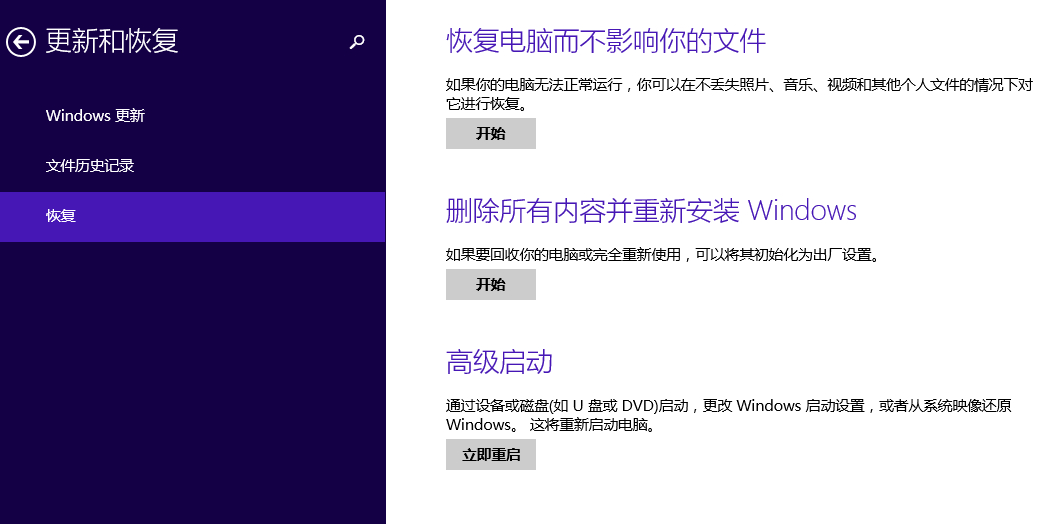 至此,完成系統(tǒng)恢復或者重裝,不需要外置光盤,或者U盤這類安裝介質(zhì)(如果只是“恢復電腦而不影響你的文件”,可以使用安裝盤或者U盤引導盤)。