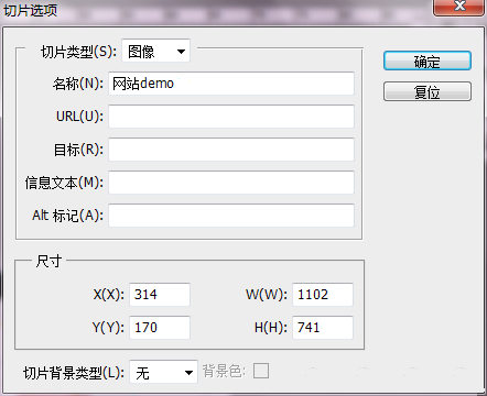 切片選項(xiàng) -- 劃取完分區(qū)以后,要對切片進(jìn)行一些設(shè)定是很重要的,切片工具下Alt+點(diǎn)擊切片,會(huì)彈出如下窗口