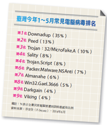 也因此,根據(jù)芬安全今年1月到5月的統(tǒng)計,主要攻擊Windows 2000、XP、2003及2008等平臺的古董病毒Downadup,在臺灣最常見的病毒排名,從2013年的第六名提升為今年1~5月的第一名。而專家也說,這個古董病毒因為是計算機蠕蟲Conficker的原始病毒,主要是利用微軟編號MS08-067漏洞,將會允許黑客遠程執(zhí)行程序代碼。至于,在2013年排名第一名的老舊的宏病毒Virus:X97M.Mailcab,是利用微軟在10年前就已經(jīng)公布的Excel 97的漏洞發(fā)動攻擊,在今年上半年則消失在前十名的排行榜中。